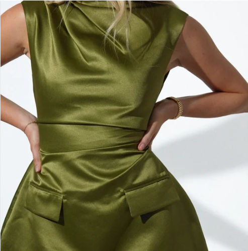 CaractéristiquesMatière : Satin premium (doux, respirant et respectueux de la peau) • Coupe : Mini, ajustée avec panneaux plissés • Détails : Deux poches à rabat signature sur la poitrine • Finition : Fronces (ruching) stratégiques pour la texture et la forme • Occasion : Idéale pour les sorties décontractées, les cocktails semi-formels ou les soirées élégantes